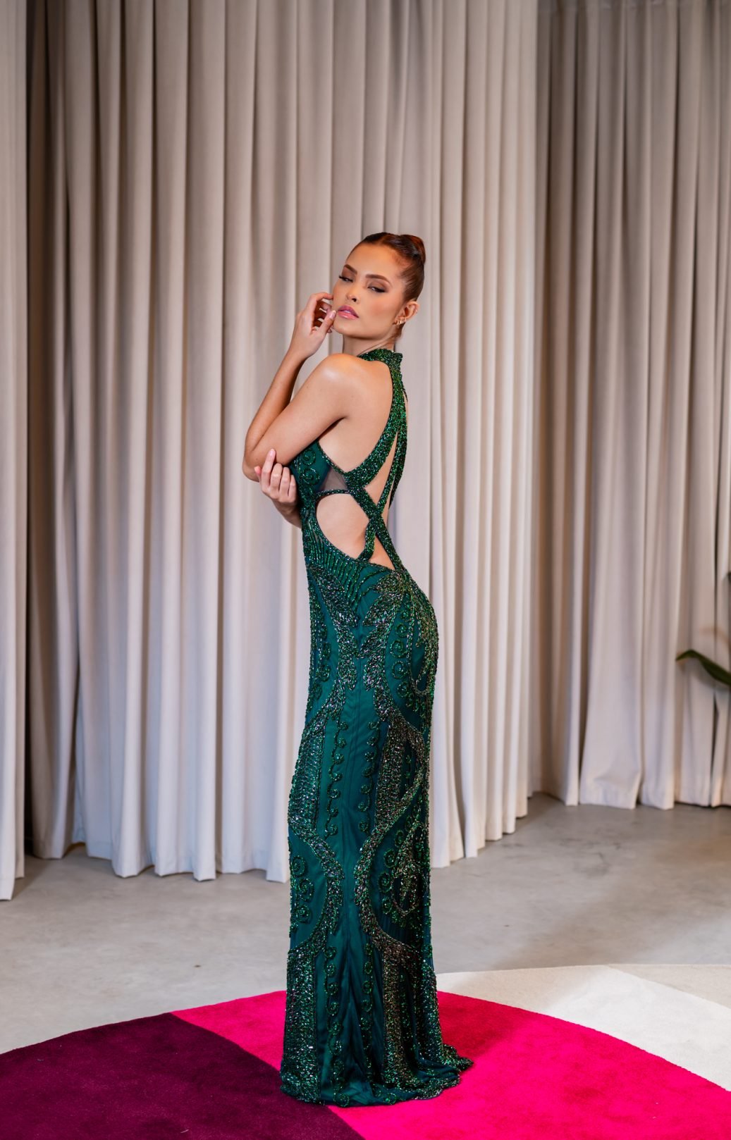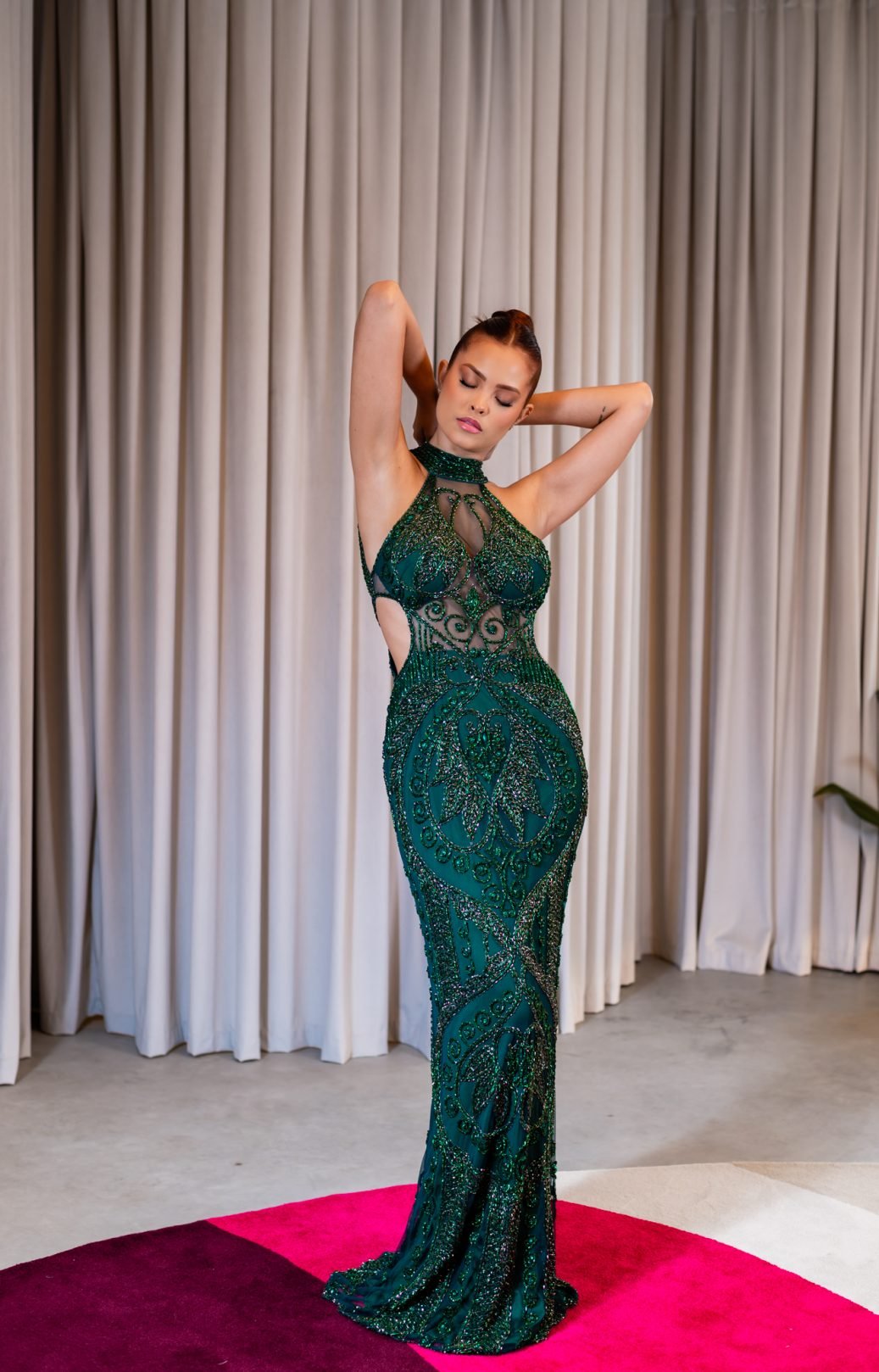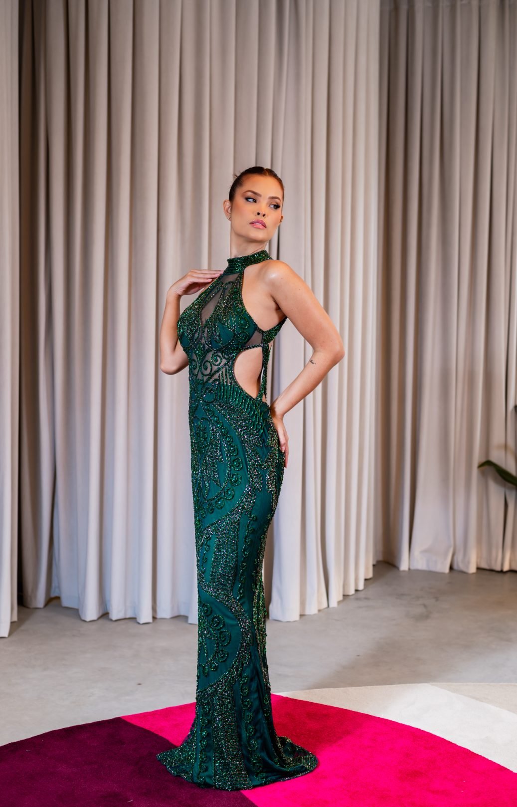 Feito com materiais de alta qualidade, o vestido tem um caimento perfeito que realça as curvas do corpo de forma lisonjeira. O decote discreto adiciona um toque de sensualidade ao vestido, que é complementado pela saia longa e fluida, criando um movimento gracioso.