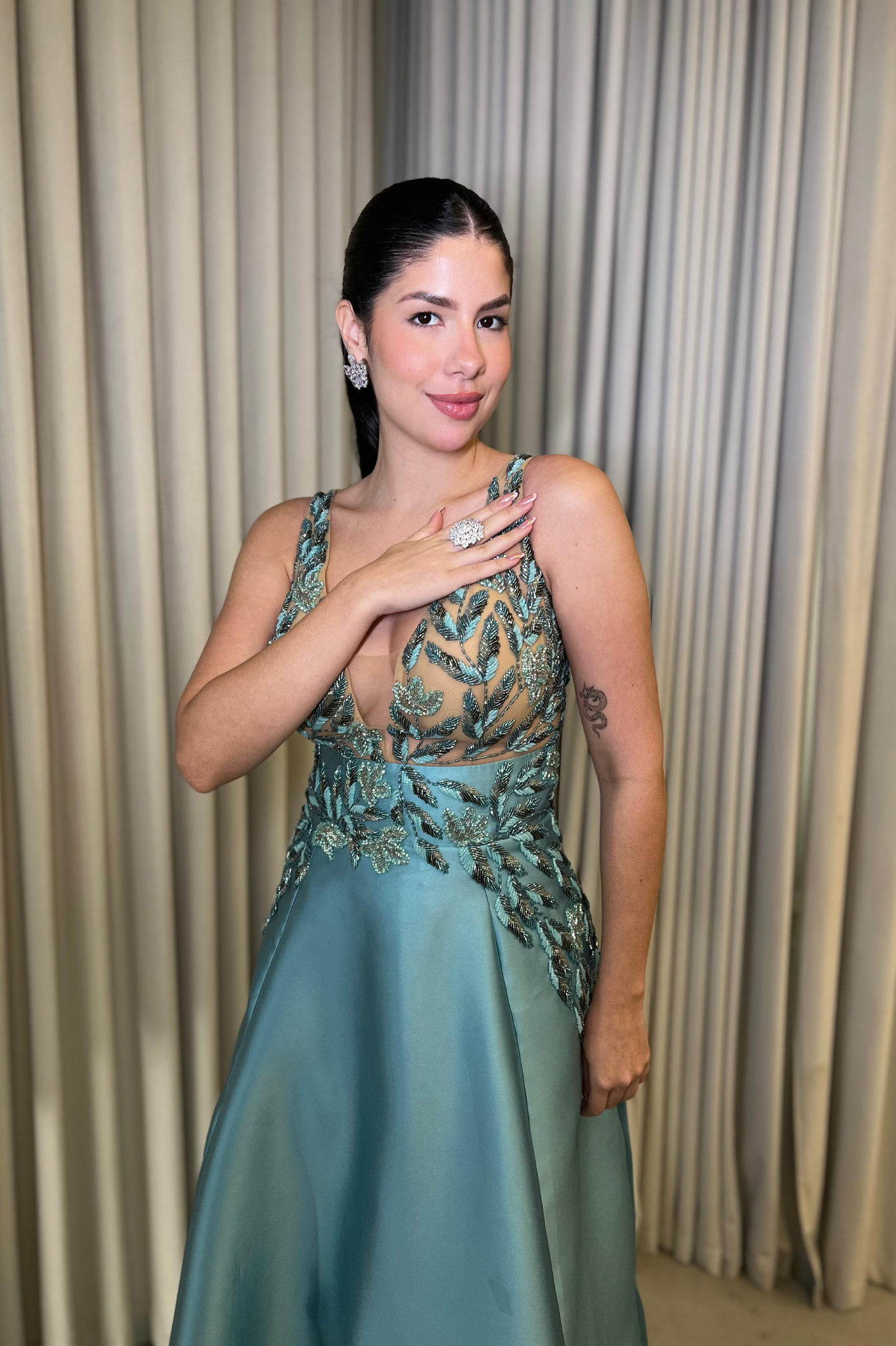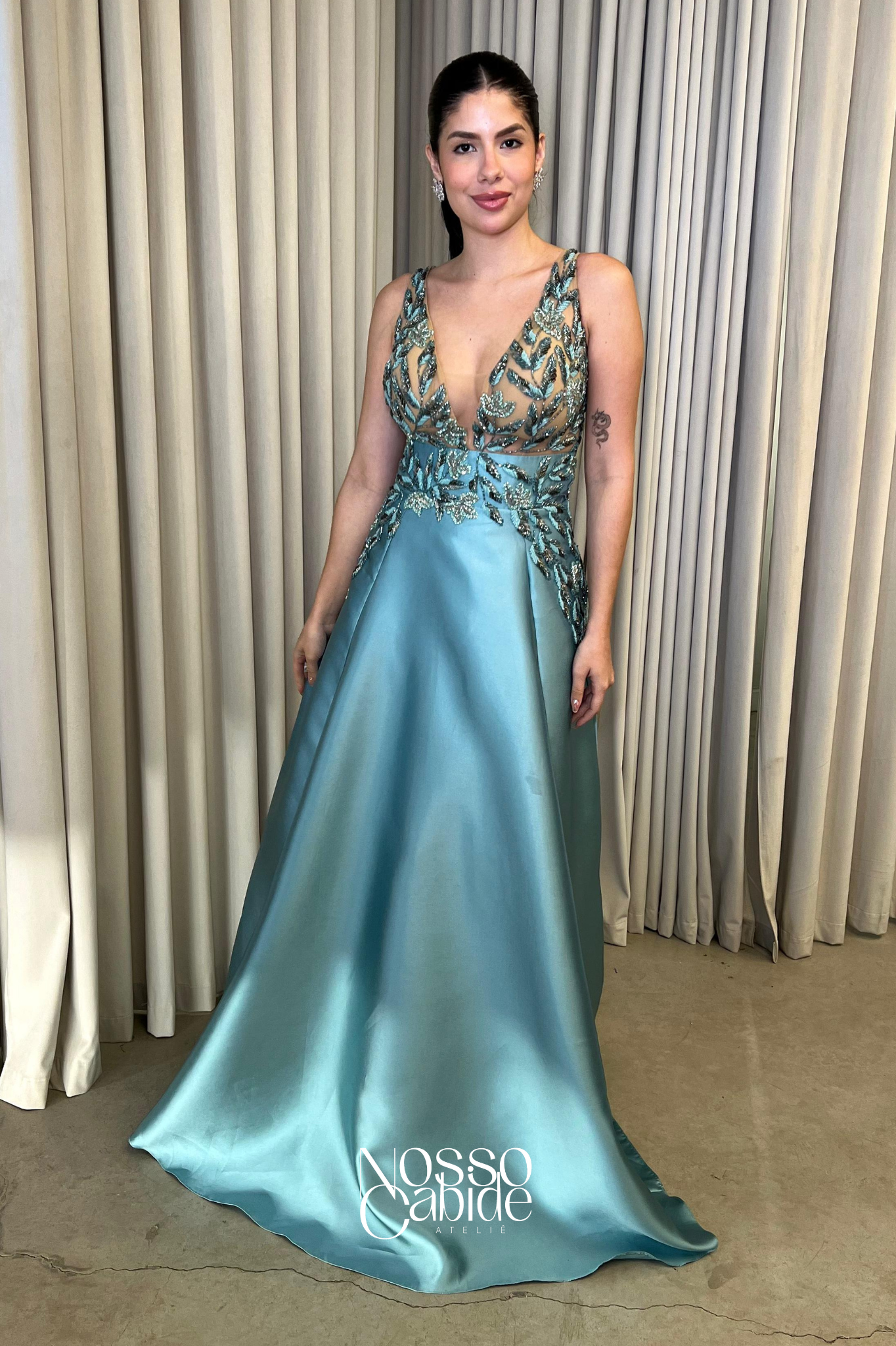 O corte impecável deste vestido realça a silhueta feminina, proporcionando um ajuste perfeito em todas as áreas do corpo. Longa e fluída acrescenta movimento e elegância a cada passo, enquanto valoriza os traços femininos.